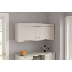 Wardrobe/Armoire by Inval finished in a rich “Espresso” laminates in durable melamine which is stain, heat and scratch resistant. Constructed from manufactured wood The unit has a functional design and is an excellent choice for your home or home office. It features two doors with brushed chrome metal handles, a hanging bar that provides spacious area for hangers and two top shelves for additional storage. The unit sits on four plastic floor gliders for easy repositioning.