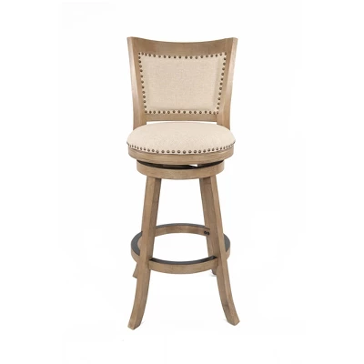 Make a statement with the Melrose Barstool. Accentuated with the attractive multistep wire-brush finish, soft linen upholstery and genuine brass nail heads. Both sides of the backrest are upholstered and lined with antiqued finish nail heads. Available in a driftwood gray wood finish with a choice of oatmeal and ivory linen upholstery. Both options are designed with precision engineering, made with solid rubber wood and guaranteed to last. The Melrose also features a full-ring footrest protected with a metal kick plate on top, double seat apron, high density foam cushion and a ball bearing steel swivel plate which provides a flawless three hundred and sixty degree swivel. Available in 24 inch, counter height as well. Due to differences in monitors as well as variances in the finishing process, colors of products may appear different from those shown on the site.