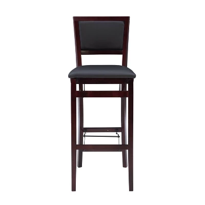 Elevate your home’s aesthetic with the 30″ Keira Padded Back Folding Bar Stool, where style effortlessly converges with convenience, creating a flawless fusion of elegance and practicality.Whether you’re hosting a dinner party or just seeking an extra dash of sophistication in your dining area, this folding stool is your ideal choice. Its wooden frame boasts a rich merlot finish that adds a touch of timeless charm to any setting. The dark brown faux leather padded seat not only exudes the appearance of genuine leather but also ensures your comfort as you dine or entertain. Plus, with front and rear supports providing extra stability, you can sit back and relax with confidence.