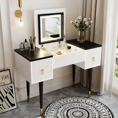 Bring a chic look to your bedroom with this elegant vanity table in contrasting shades of classic minimalism. The vanity table has a square mirror that can be hidden, with LED lights on both sides of the mirror, giving you a perfect makeup experience. The metal handles are paired with drawers and hidden storage spaces, which can be used to store your daily necessities to keep your bedroom tidy and organized.