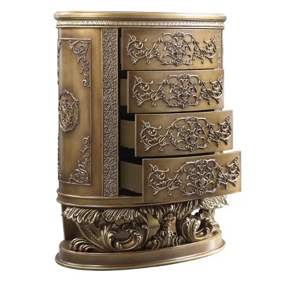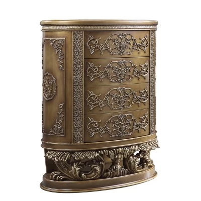 The grand Baroque style of the Constantine collection is sure to impress. With a beautiful bronze finish to emphasize the scrollwork and regal aspects of the collection. The bed features intricately carved embellishments and an oversized PU padded headboard, it is sure to be the focal point of your bedroom. The matching case goods provide style and plenty of storage with their ample drawers. Transform your bedroom into a glamorous boudoir with the Constantine collection.