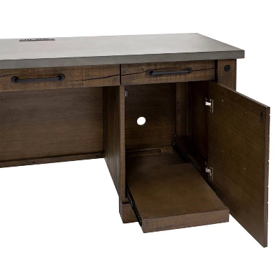 Jasper makes a rugged addition to any home or office. The rough-hewn wood finish highlights intentionally split wood veneers to provide authentic, aged character. While faux concrete tops add to the mix of materials imparting rustic industrial appeal. This item has three utility drawers and one locking file drawer for ample storage.