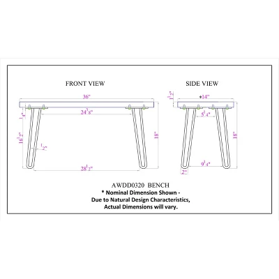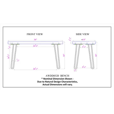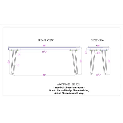 Mid-century meets Modern Industrial with these Natural Live Edge table tops and hairpin metal legs. Each tabletop is unique; no two tops will be exactly alike. Constructed of natural acacia wood. Each of our live edge products includes nylon floor protectors. The knots and cracks add to the wood’s character. A clear natural finish enhances the beautiful features in each piece of wood. The 36″ and 48″ wide bench is versatile and perfect for the entryway, accent in the dining area or a small cocktail table in the living room. You can sit on the sturdy bench to remove your shoes in comfort.