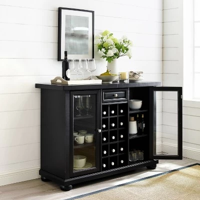 Elegantly entertain guests with the Alexandria Sliding Top Bar. Beautiful, beveled glass doors and bun feet add classic style, while the versitile sliding top provides extra serving space. Behind the glass doors, adjustable shelves offer plentiful storage space for spirits and barware. The removeable center wine rack holds up to 15 bottles of wine. Make at home entertaining a breeze with the Alexandria Sliding Top Bar. OVERALL PRODUCT DIMENSIONS: 47.75”W X 19”D X 34”H