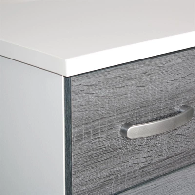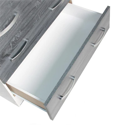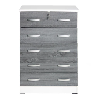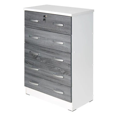 Better Home Products Cindy 5 Drawer Chest Wooden Dresser with Lock strikes a perfect balance between your storage as well as design requirements. It is manufactured entirely out of engineered wood which it makes it durable for many years. This chest has 5 drawers, and each drawer has sufficient support under them to handle extra weight, making the drawers sturdy. Up the drama by topping this simply chic chest with an abstract sculpture and large framed family photos. Only top drawer has a lock (and key) to keep your valuables safe. Available in Beech, Black, Mahogany, White, Tobacco, Gray, Pecan, Silver, Beech & Blue and White & Pink, Ebony (Black & Gray), White & Gray color options. Assembly required.Features : Durable 5 drawer chest crafted from fade resistant laminated engineered wood in white and gray combination color finish.Contemporary style – fits any décor providing a modern and cohesive ambience. Five drawer dresser provide ample storage.Lock and key available on top drawer (only), keeps your business private. Elegant silver finish plastic bar handles.Each drawer has euro-glide metal tracks with safety stop and support for a sturdy long lasting chest. Each drawer supports up to 40 lbs.Overall Dimension: 15” D x 29” W x 44” H. | Drawer Dimensions (Inner): 12.5” D x 24.5” W x 4” H.This sturdy 5 tier chest of drawers can be used in closets, bedrooms, nurseries, playrooms, entryway, church and office. Besides, this drawer chest is an ideal for small spaces such as apartments and dorm rooms.Requires complete assembly by 2 adults – Do not use power tools to assemble your furniture.Specifications : Product Dimensions : 15” D x 29” W x 44” HProduct Weight : 60 lbsAssembly Required : Yes