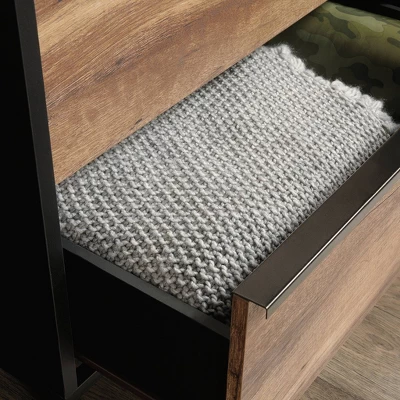 Style and storage all in one. Give your bedroom a stylish new upgrade while adding the convenient storage space that you need with this 3-drawer chest from the Boulevard Café collection. This industrial-inspired dresser features three spacious drawer that open and close on smooth metal runners. These large drawers are ideal for stowing away a variety of different items like stacks of denim jeans and button-up shirts to cozy sweatpants and your collection of t-shirts. You can find a place for all your things! This chest of drawers also features a large open shelf that provides you with additional storage space for easy access storage of items like your wallet, makeup bag, purse, and perfume bottles. This bedroom dresser includes a roomy top surface for storage and display of an accent lamp, a small mirror, decorative plants and more! This 3 drawer chest features a durable, powder coated metal frame with a perforated back for an extra touch of detail. Finished in Black with Vintage Oak accents, this bedroom chest will have you feeling organized in no time.