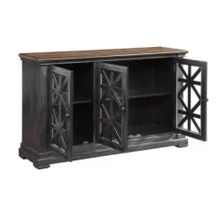 Crafted with a rustic farmhouse charm, this storage credenza combines clean lines and natural wood textures in a look that escapes an easy definition. Our large credenza is made from solid mango wood that is finished in Coen Rustic Brown. With a total of six drawers, three on either side of two internal shelves, this credenza is packed full of storage options. Trendy metal sliding barn doors add the perfect amount of cozy cabin or farmhouse-inspired style that would make this piece a statement piece in any room.