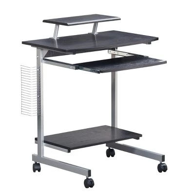 This Techni Mobili Compact Computer Cart is made with heavy-duty engineered wood panels with a moisture resistant PVC laminate veneer and a scratch-resistant powder-coated steel frame. The adjustable shelf can be mounted center, right or left of desktop. It also features a slide-out keyboard shelf equipped with a safety stop, side media rack for CDs or DVDs, bottom accessory shelf, large bottom shelf to accommodate a CPU and accessories, and large double-wheel non-marking locking casters. The desktop has a 100lb weight capacity, the shelves each have a 30lb weight capacity, and the keyboard shelf can hold up to 20lbs. Color: Graphite
