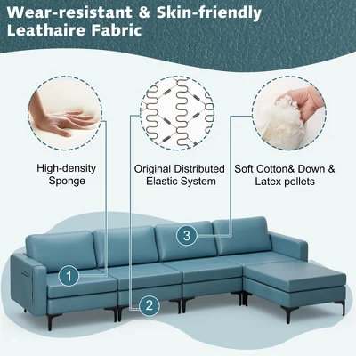 You can reset the ottoman for right facing or left facing L-shaped sectional sofa. The frame of the sofa couch is composed of heavy-duty steel, solid wood and pressure-disperse spring, providing long service life and awesome weight capacity. The ergonomic backrest, overstuffed back cushions and high-density sponge padded thick seat cushions supplement each other, transform the modular sofa into a cozy spot in your room. As for convenience, the power socket, USB port, hidden storage box and armrest caddy holder do a lot of help.