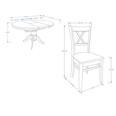 - Table dims: Overall: 41.73- 57.5″ W x 41.73″ D x 30.31″ H; Buttefly Leaf: 15.75″ W x 41.73″ D; Pedestal Base 8.27″ Diameter x 17.13″; Top Fluted Section: 1.78″ H, Curved Mid-Section: 7.48″ H, Bottom Fluted Section: 7.87″ H.; Pedestal Leg: 2.36″ – 3.94″ W x .87″ D x 16.54″ L; Chair dims: 35.24″ H x 17.4″ W x 17.91″ D; Seat height from floor: 17.72″; Leg bracing from floor: 11.61″; Seat dimensions: 17.13″ W x 16.34″ D x .87″ H; Max Width between Rear Legs: 16.73″; Heigh of ‘X’ motif: 11.42″