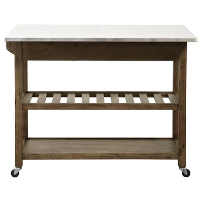 Bring portable storage and prep space to your kitchen with the Hadley Kitchen Cart with Drop-Leaf. Whether your current kitchen is lacking in cupboard space or you dream of a kitchen island, this cart has the functionality and handsome good looks to suit your needs. Use the adjustable open shelving to store extra pots, pans, and dishes, while storing utensils and other cookware in the two drawers. There’s even a towel rack on the side to keep your tea towels close to hand while you cook. The use of mixed materials allows you the versatility to seamlessly fit this cart in any rustic, farmhouse, or industrial style home with effortless ease. This kitchen cart is constructed from durable solid Acacia wood and stainless steel. Finally, the wood is finished in a wire-brushed Barnwood color which enhances the beauty of the Acacia wood’s natural grain.