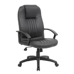 This executive LeatherPlus chair is beautifully upholstered with black LeatherPlus, a combination of leather and polyurethane that’s as soft as it is durable. It features passive ergonomic seating with integrated lumbar support, durable polypropylene arms, an upright locking position, adjustable tilt tension control, and pneumatic gas lift seat height adjustment for a seat height that extends from 19” to 22”. All of this sits atop a sturdy 27” nylon base with five hooded double wheel casters.