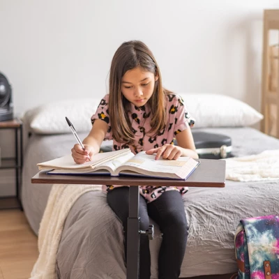 This IRIS USA Laptop table is moisture resistant PVC laminate veneer table and adjustable height. The table supports up to 74 pounds to create a strong and sturdy temporary home working station in an instant. With the two lockable wheels with table legs when standing of the legs the stand will not get in the way.