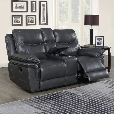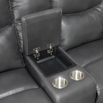 Recline in comfort with Isabella by Steve Silver Company. Pillowtop arms and extra back padding give the Isabella Recliner Loveseat the plush seating you deserve. The double reclining loveseat features include a center console with a storage compartment and two cup holders to keep important items in reach. Upholstered in an easy to clean vinyl with decorative contrast stitching for an updated look. Available in your choice of Gray or Sand upholstery.