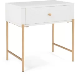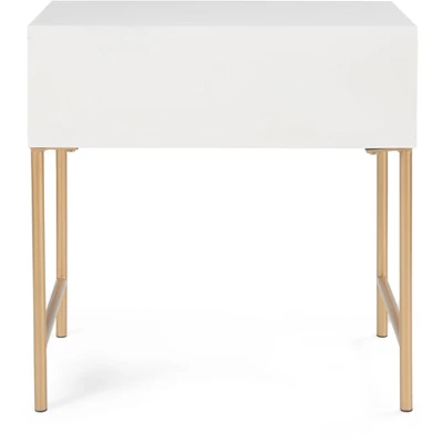Get rid of excess clutter with this modern end table. One drawer offers plenty of extra storage space to keep things like remote controls and chargers. The clean, contemporary design is a great way to update your decor. An eye-catching white finish will be a breath of fresh air to your existing decor. Slim gold legs add to the warmth of the overall design. Elegant and durable, this glam accent table is the perfect solution for small spaces.