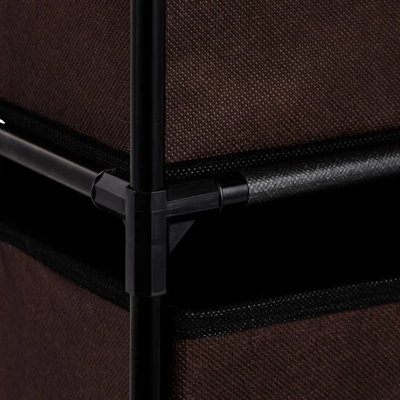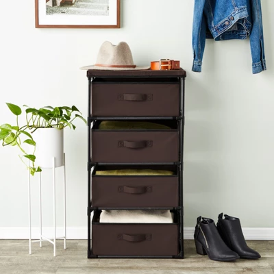 Our 4-layered fabric storage dresser is great for clothing, documents, school supplies, and household objects. Simply designed for convenient use, it can be placed in a closet, near a dresser, in the bathroom, or in an office. Constructed using steel tubing for the drawers and frame, the 4-tier clothes 4 drawer storage organizer can be counted on for everyday storage. This clothes organizer weighs 5.5 pounds and measures 16.5 x 13.2 x 33.4 inches. Multiple units or portions of multiple units can be combined to create a taller drawer dresser.