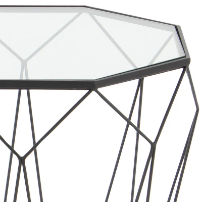 - Black side table with open grid geometric base that forms an octagon at the top and a smaller octagon at the bottom and transparent glass inlay