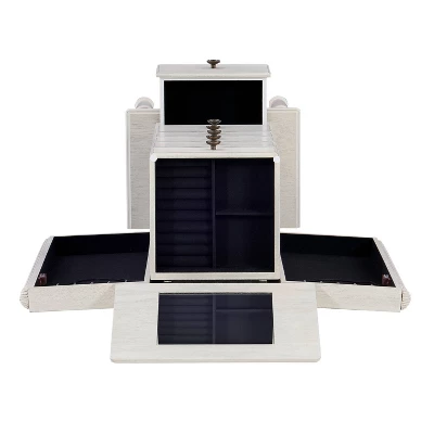 Creamy white jewelry armoire is perfect for safeguarding precious keepsakes and applying makeup for fashionable moments. Soft felt lined drawers with antique burnished pulls make it easy to organize rings, watches, earrings, bracelets and beloved treasures safely, while cushioned side panels swing wide open to reveal 10 hooks for keeping necklaces secure and tangle free. Features include large flip top vanity mirror and solid wood vertical construction for years of everyday use. Ornate carving at top with wood turned legs and scalloped apron invite provincial elegance.