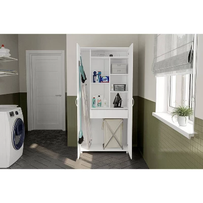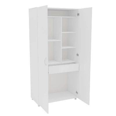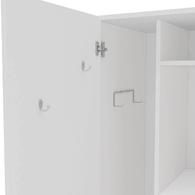 The Santa Fe 2 Door Storage Cabinet from Polifurniture is just what your home needs. This cabinet is perfect for your kitchen, laundry area or any room in your home that needs extra storage. This cabinet features plenty of storage options to keep your home looking neat and organized. There are 6 open cubbies in various sizes, two larger storage sections perfect for bigger items, and 1 large drawer. There are 4 hooks to hang items and utilize more space. Constructed from engineered wood with a durable and resistant melamine finish. This versatile cabinet’s simple modern design and white finish will fit with any current home décor.
