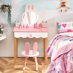 Costway Kids Vanity Set Rabbit Makeup Dressing Table Chair Set W/ Mirror Drawer WhitePink