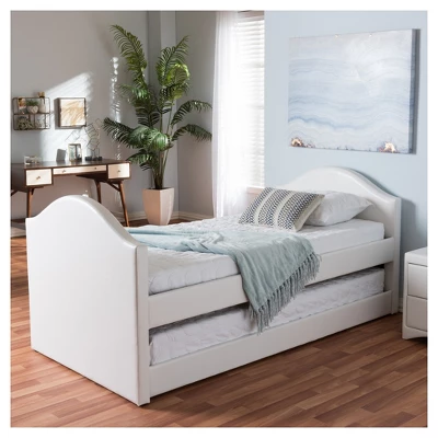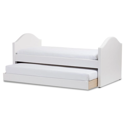 The Alessia guest bed is a great combination of both a practical trundle bed and a daybed for children of all ages. The guest bed is an ideal choice if you are looking for a practical and versatile solution to accommodate guests, or a spare bed for children’s sleepovers. This beautiful guest bed accommodates two standard size twin mattresses making it ideal for children and adults. Manufactured from wood, the Alessia guest bed is a fantastic model with a solid frame that will really stand the test of time. Upholstered in high quality faux leather and padded with foam, the under bed is easily accessible by sliding out the trundle. To turn the Alessia into a daybed, simply push the daybed against the wall with couple throw pillows and some soft toys. It will immediately be your next favorite reading nook to snooze off. Made in Malaysia, the Alessia guest bed requires assembly.