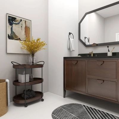 - •This metal bar cart carries a solid black frame and 3 dark brown wood oval trays